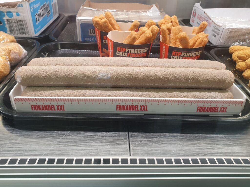 Snackspert Eke Bosman nam al enige tijd geleden de proef op de som. Hij wilde weten of er ook xxl-frikandellen in het worstvormige schaaltje passen. Dit bleek niet het geval. Voor cafetaria-vitrines zijn er, getuige de bijgaande foto, wél speciale schalen voor de presentatie van extra lange frikandellen beschikbaar.