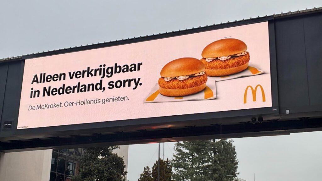 Je hebt het vast voorbij zien komen: het billboard met de tekst: ‘Alleen verkrijgbaar in Nederland, sorry. De McKroket. Oer-Hollands genieten.’ Daarmee speelt McDonald’s handig in op de opmerking van Jenning De Boo die na zijn tweede zilveren medaille op de 500 meter naar de hamburgerketen in Italië ging. Maar daar was zijn favoriete snack (de McKroket) tot zijn teleurstelling niet voorhanden.